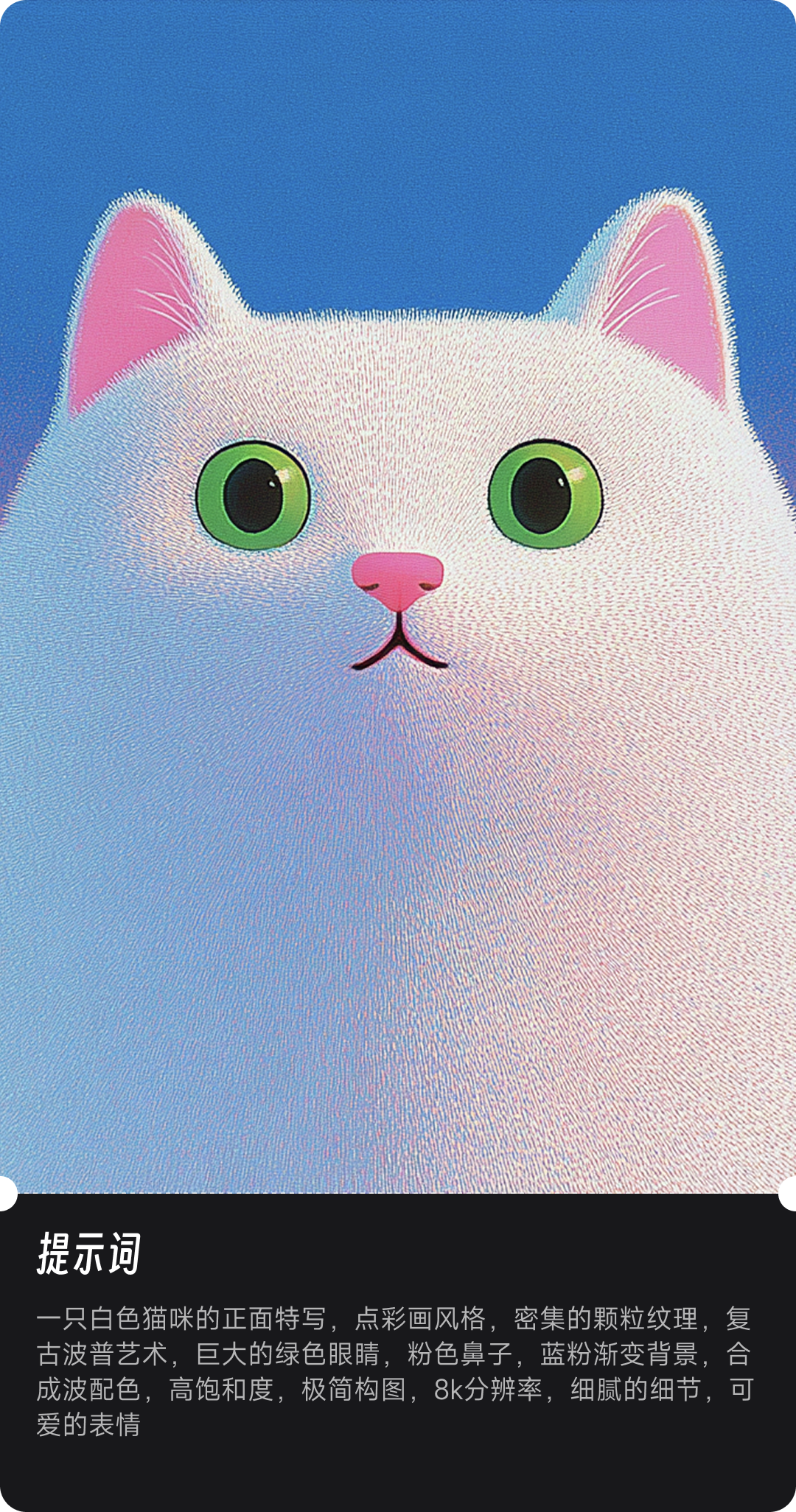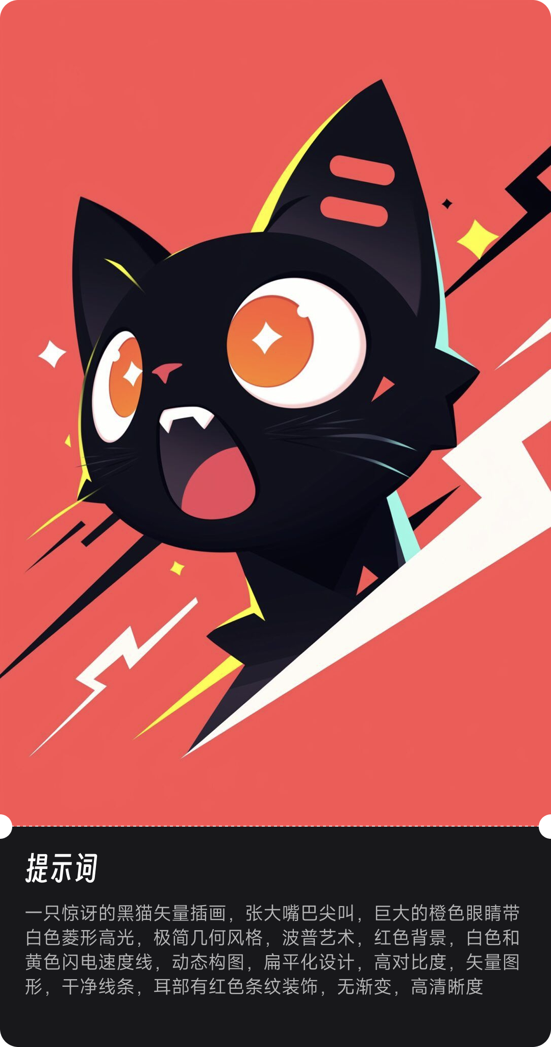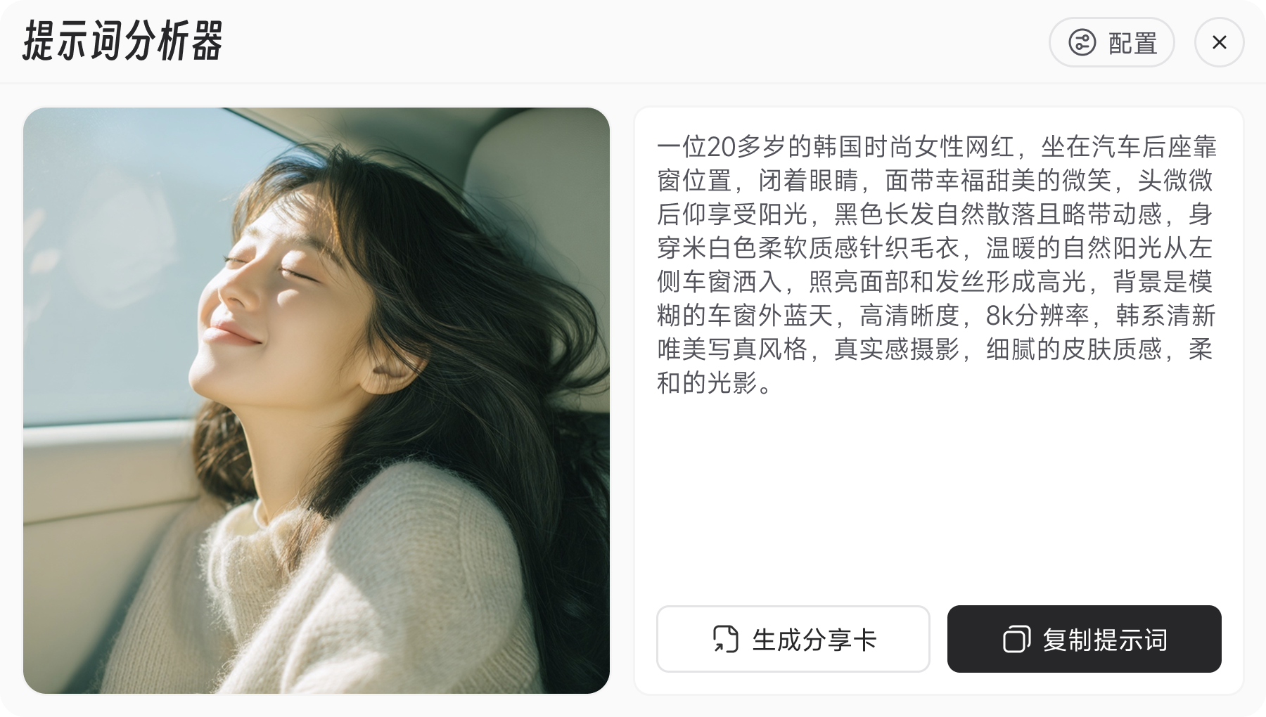 提示词分享卡会把原图和分析出的提示词排版成一张图片。你可以保存到本地,也可以复制后粘贴到社交软件、笔记工具或设计文档中。